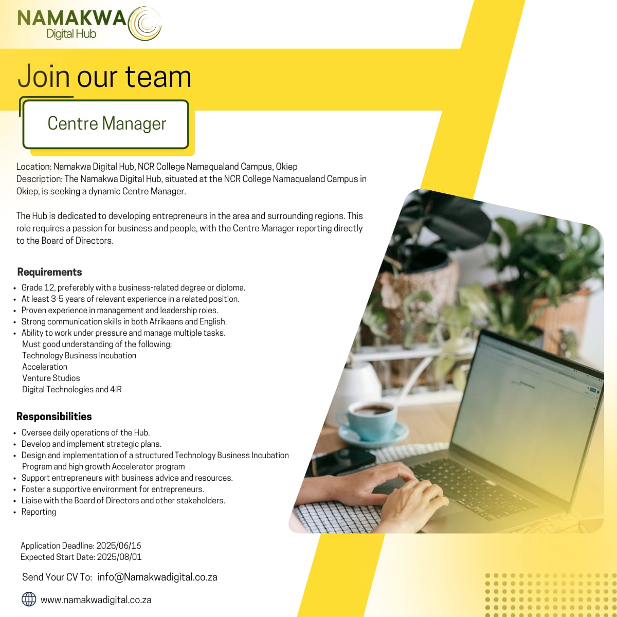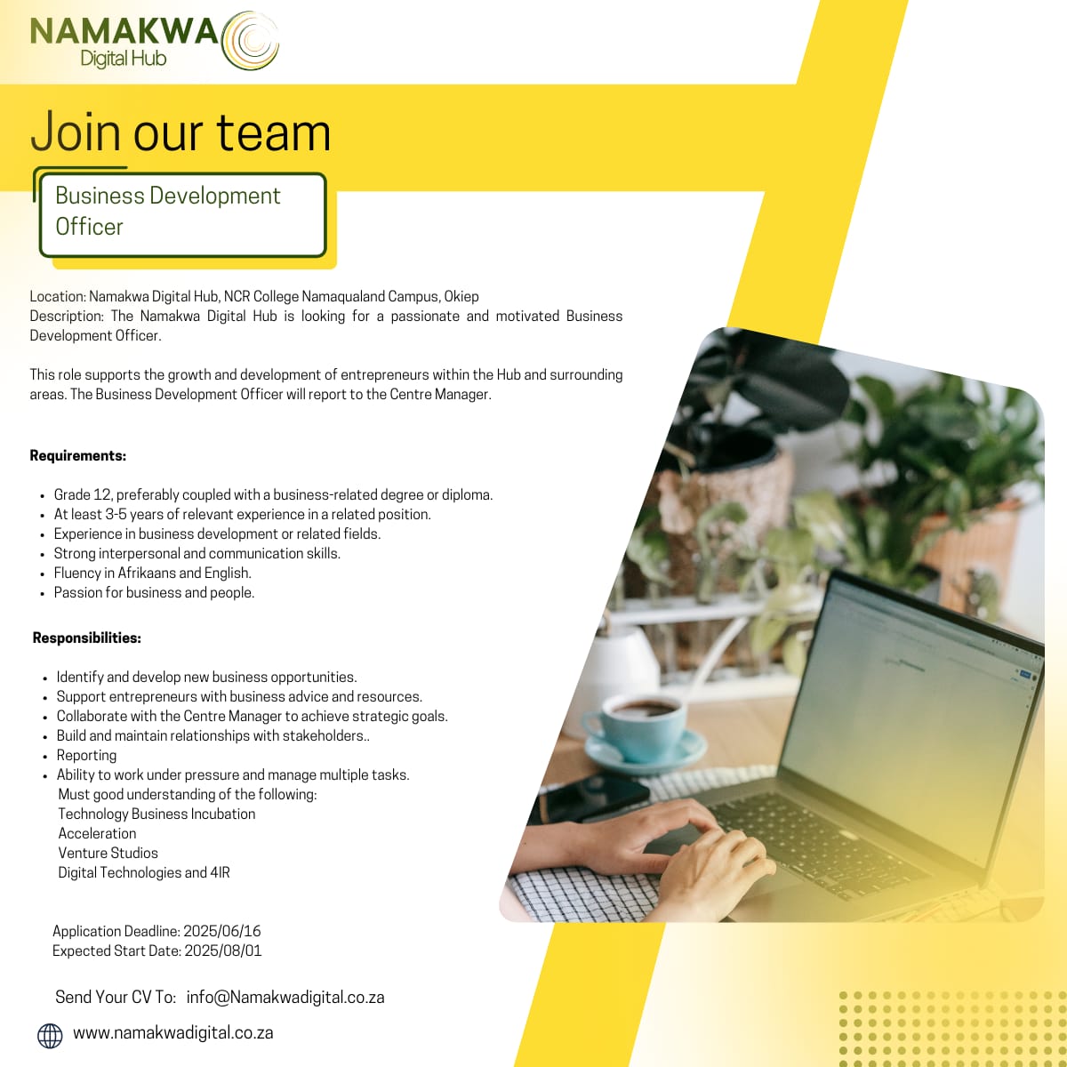 We’re looking for bold, innovative minds to join us in shaping the future of digital innovation and entrepreneurship in the Namakwa District Municipality.